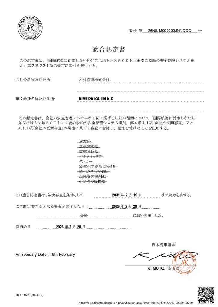 先日、船級協会である 日本海事協会(NK)様より会社のDOC(適合証書)の審査を受け、安全管理システムが基準に適合していることが正式に認められ、更新することが出来ました。